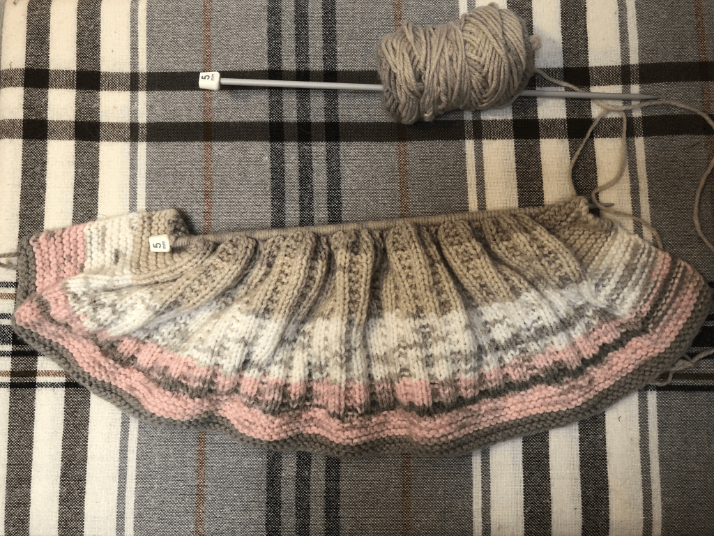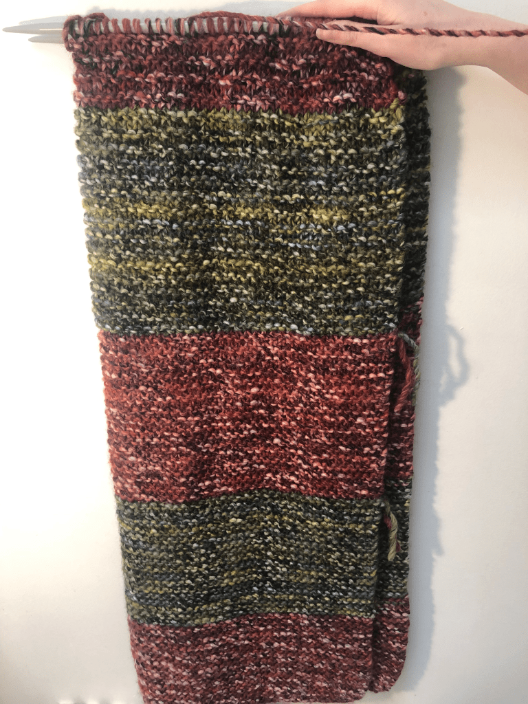 Next, I have a blanket I’ve been working on since September. This is one that I’m knitting for us—I’d originally planned to give it away but I love how it’s turned out so far and I don’t want to give it up anymore. This is using Katia Inca Ice in the colours ‘Reds Orange’ and ‘Green Ochre’. I’ve put this aside until I’ve finished with the gifts.