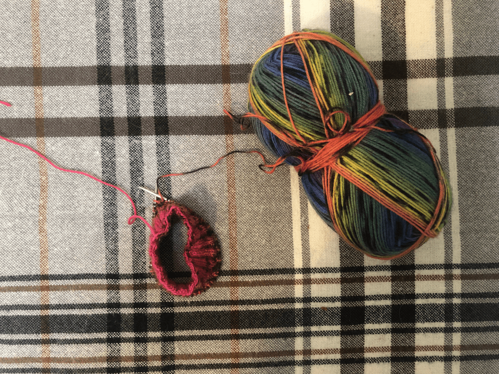 Last weekend I started my first pair of socks ever. This yarn is the Twin Soxx sock wool from Lang Yarns but I’ve lost the colour name—it’s their rainbow one anyway. My partner picked it out for himself and I decided to use it as my first pair. This is not super high on my priority list right now since we do live together I can just pass them over to him whenever they’re done rather than trying to push for Christmas.