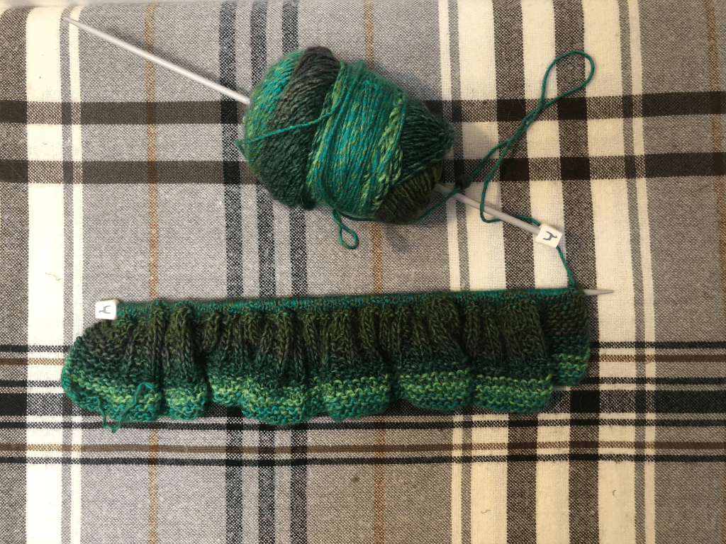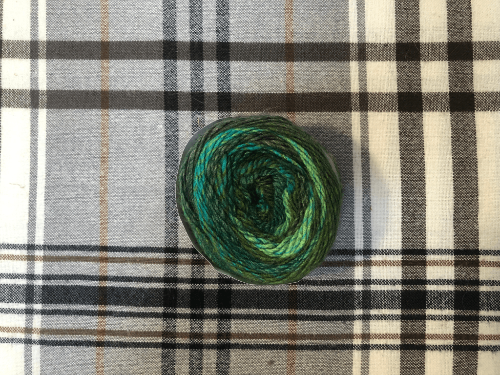 Next is also from Lion Brand, I got some of the Ferris Wheel line in the shade ‘Evergreen’. This looks deceptively thicker in the ball and has a bit of a strange silky texture on the needles. It looks okay knitted up but I’ll see how I feel at the end.